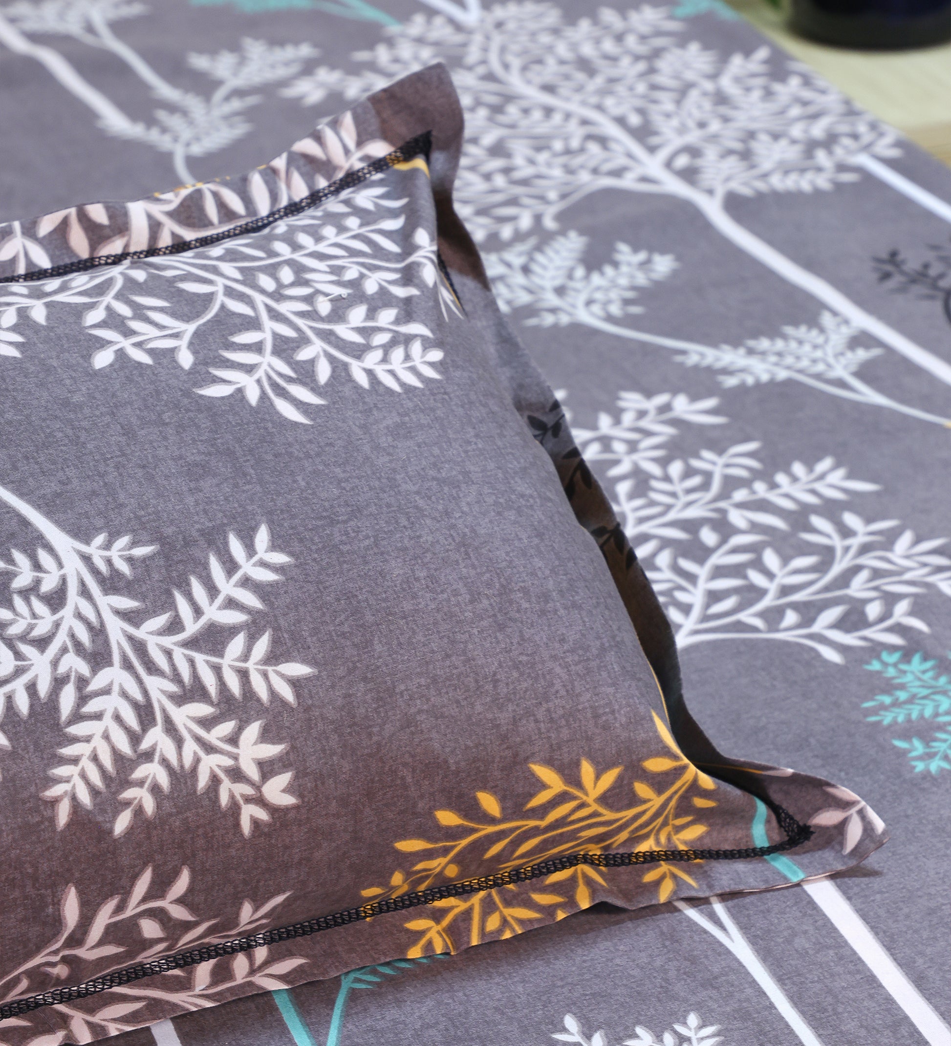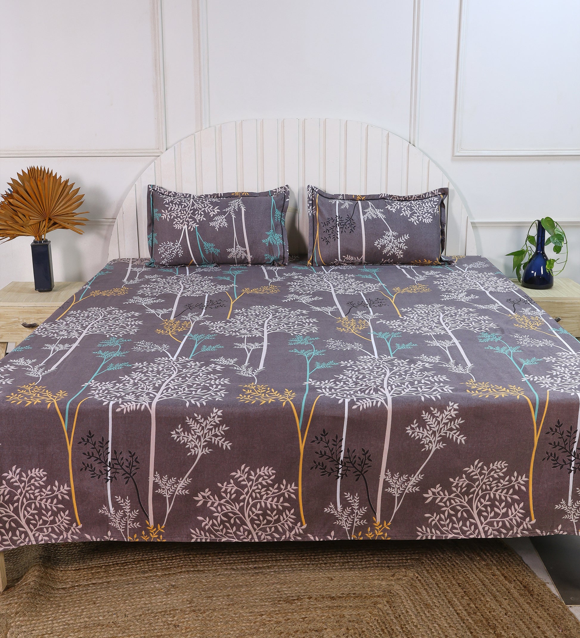 Elevate your bedroom décor with this modern dusty grey bedsheet set featuring elegant tree silhouettes in teal, mustard, white, and black. Designed for those who appreciate minimal yet artistic aesthetics, the soothing grey backdrop provides the perfect canvas for the nature-inspired print to stand out.