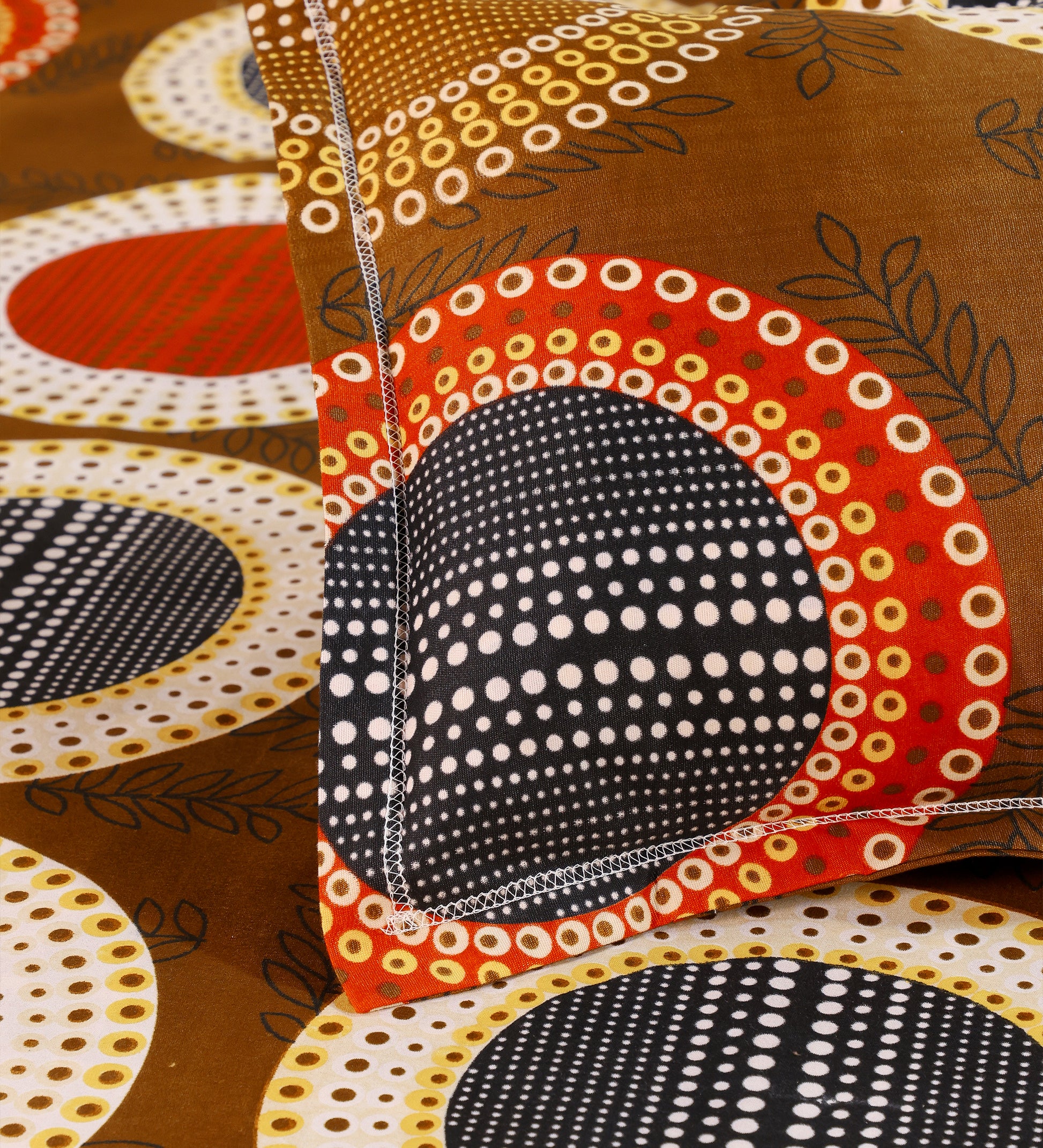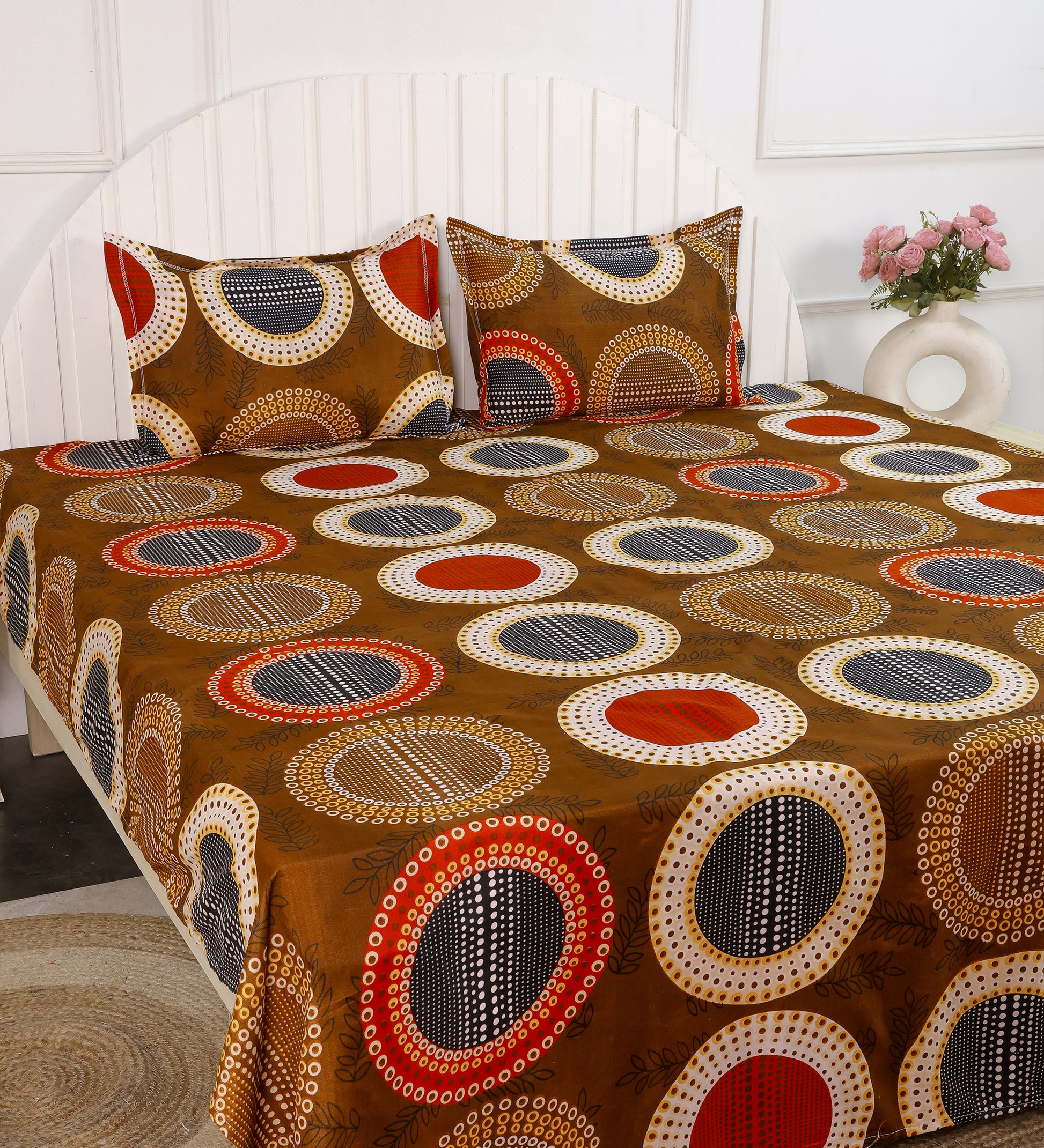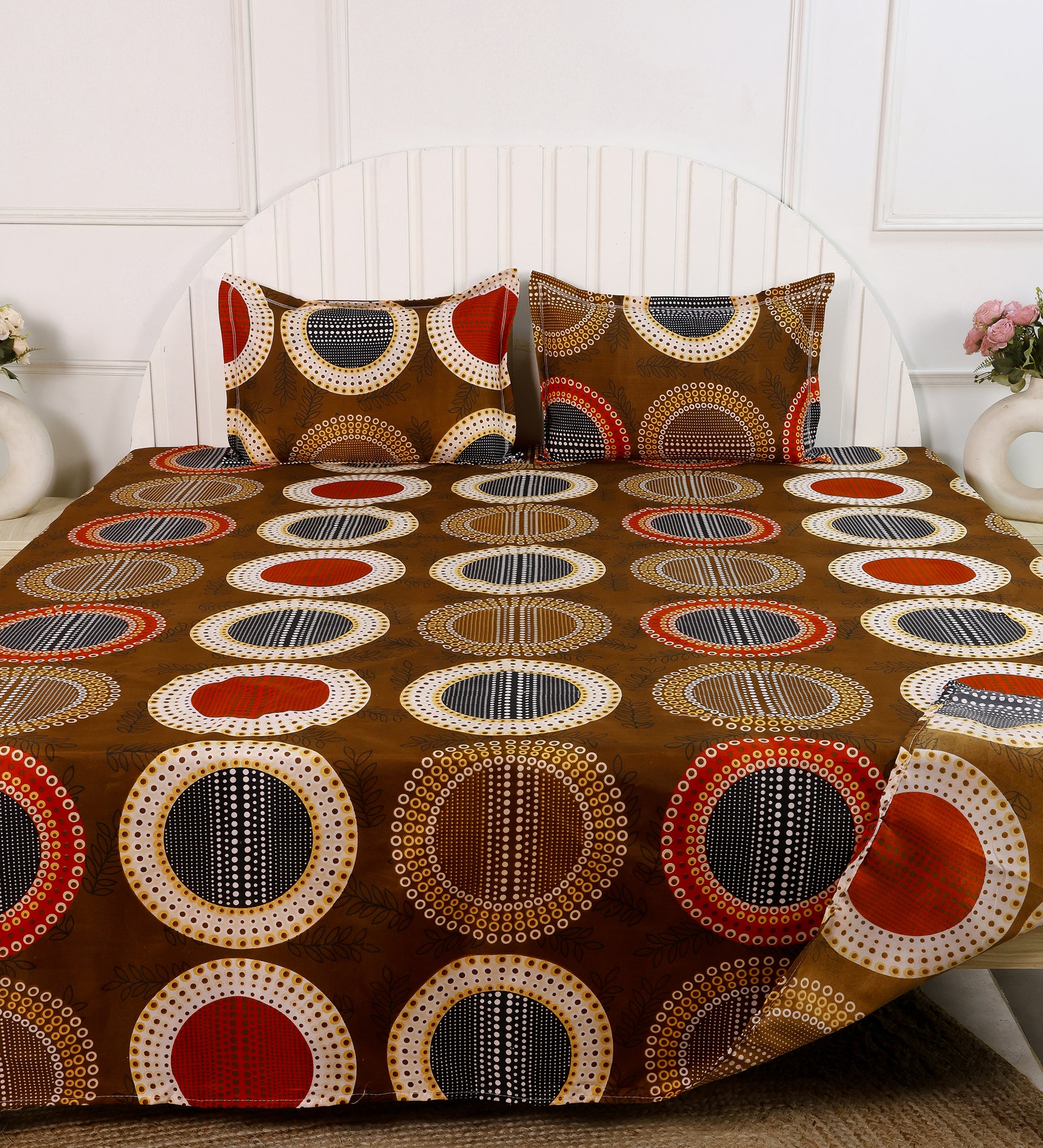 Add warmth and elegance to your bedroom with this striking brown geometric bedsheet set. Featuring a bold circular pattern in shades of red, black, cream, and mustard on a rich brown background, this design offers a unique blend of modern and ethnic charm.