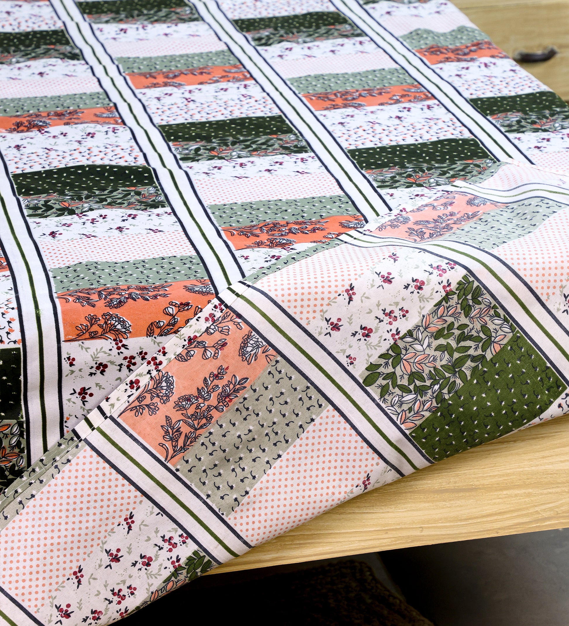 The bold geometric patchwork in earthy tones of green, orange, black, and white adds a vibrant and ethnic charm to your room. The set includes a top sheet and matching pillowcases that perfectly complement the overall design, giving your bed a complete and coordinated look.