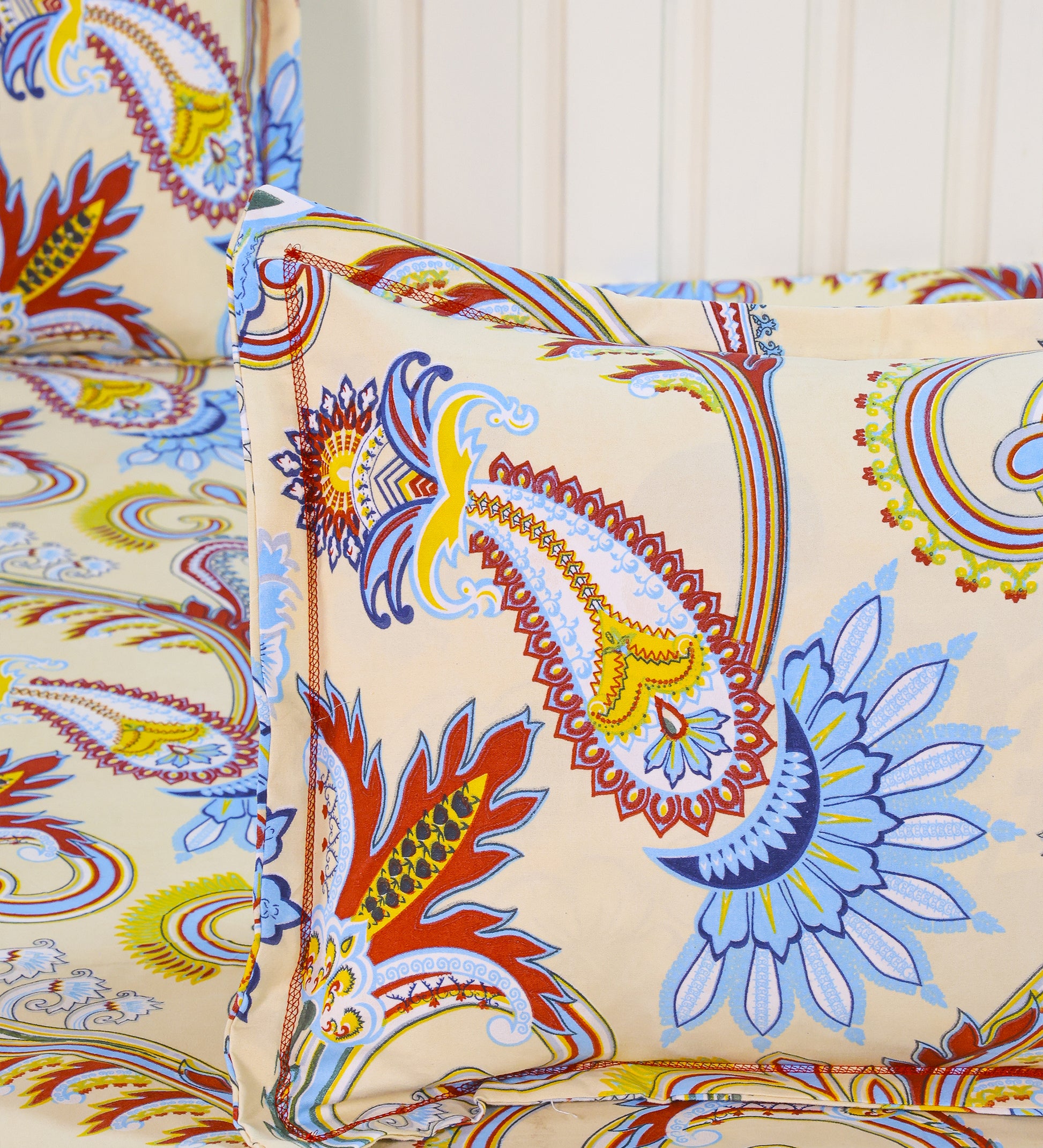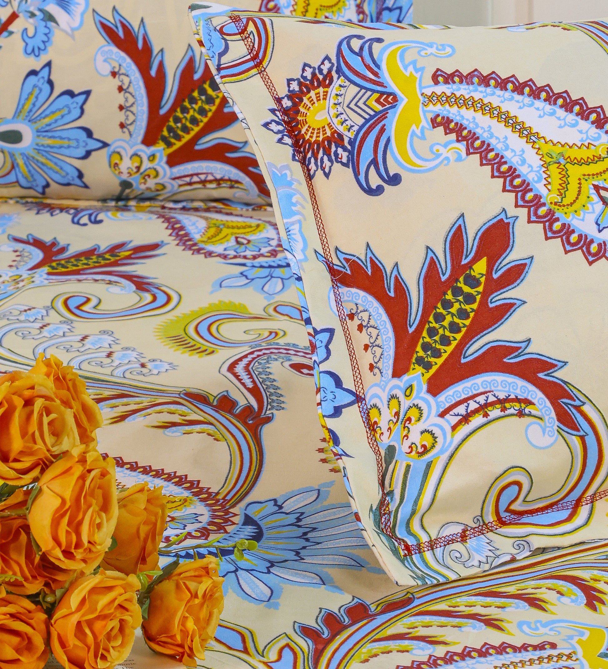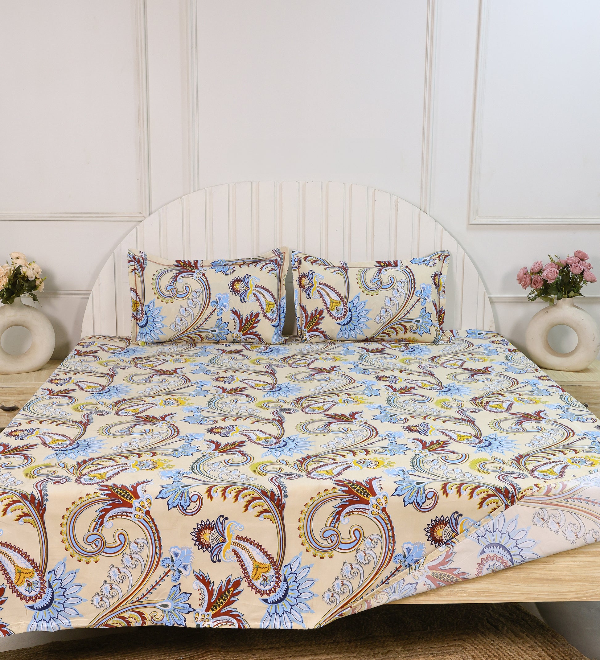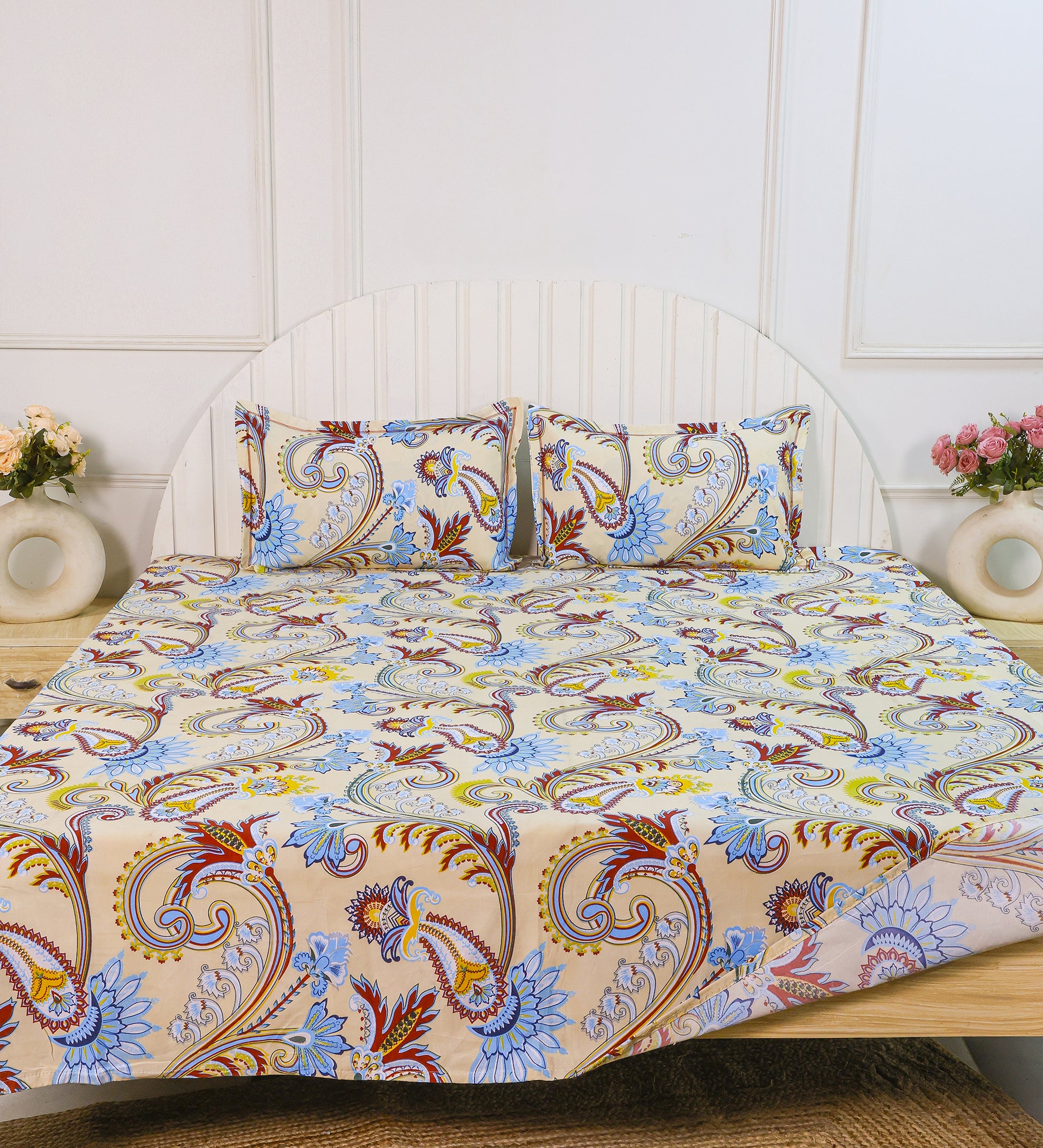 Infuse your bedroom with timeless charm using this beautifully printed beige bedsheet set, adorned with an intricate floral and paisley motif. A delicate blend of soft blue, maroon, and yellow floral patterns pops against the warm beige background, creating a serene yet vibrant ambiance.